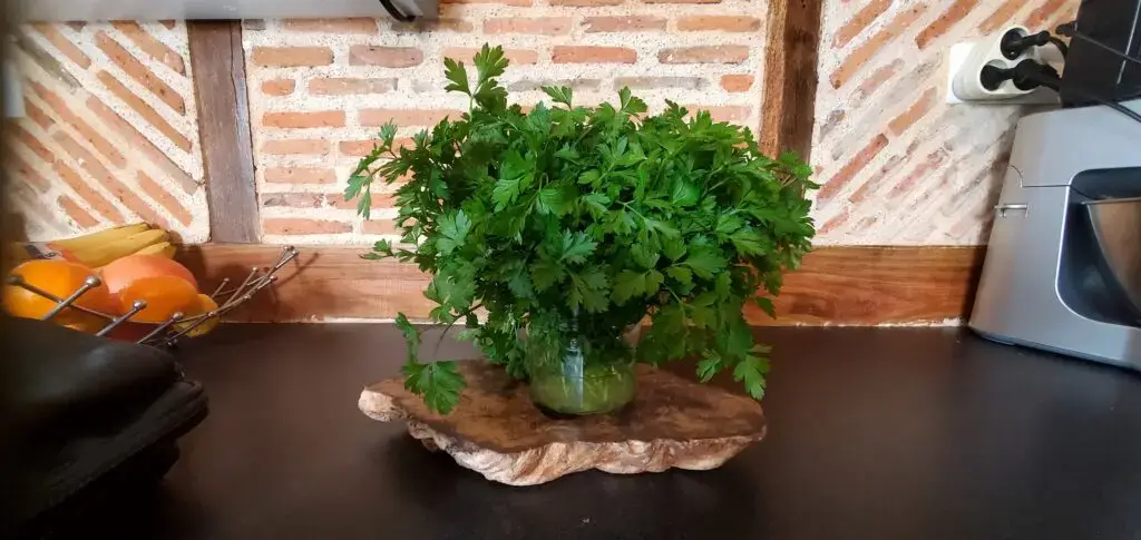 - La technique du bouquet (au frigo) : Pour les herbes à tiges tendres (persil, coriandre, menthe), traite-les comme des fleurs. Coupe la base des tiges, place-les dans un verre avec un fond d’eau ou enroule les tiges dans un sopalin ou petit torchon humide. Elles garderont leur fraîcheur pendant une bonne semaine.