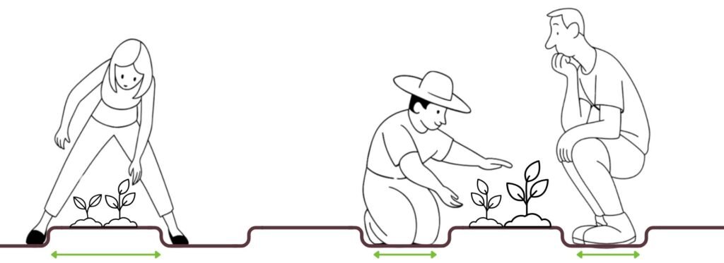 • Largeur des planches : l’écartement de jambes de la plus petite personne qui utilisera fréquemment le jardin.